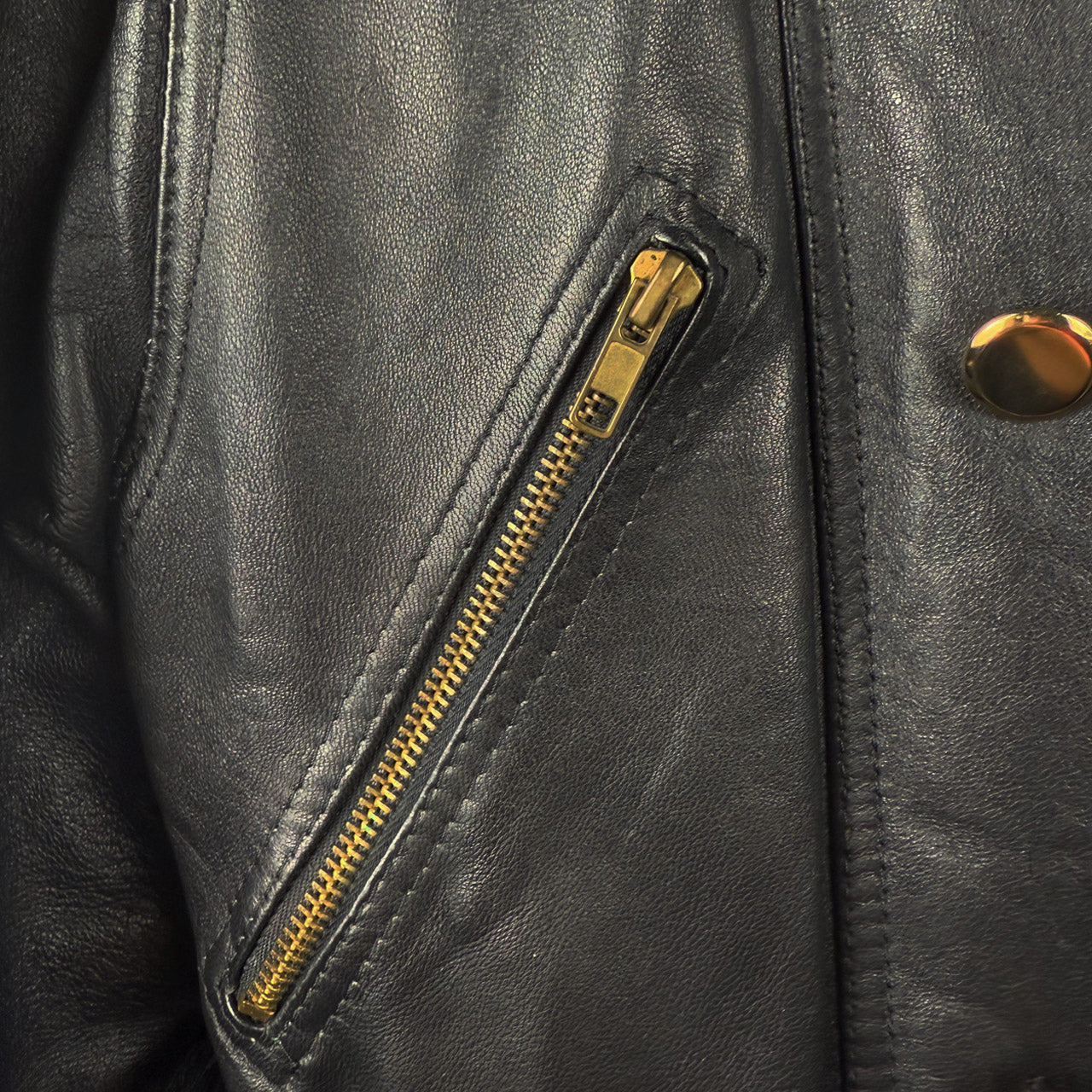 Vintage black leather biker jacket, featuring a cropped fit and gold metal details. It's an iconic '80s piece that can be paired with a variety of outfits to create a bold, rock look.