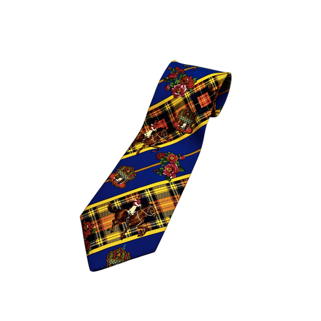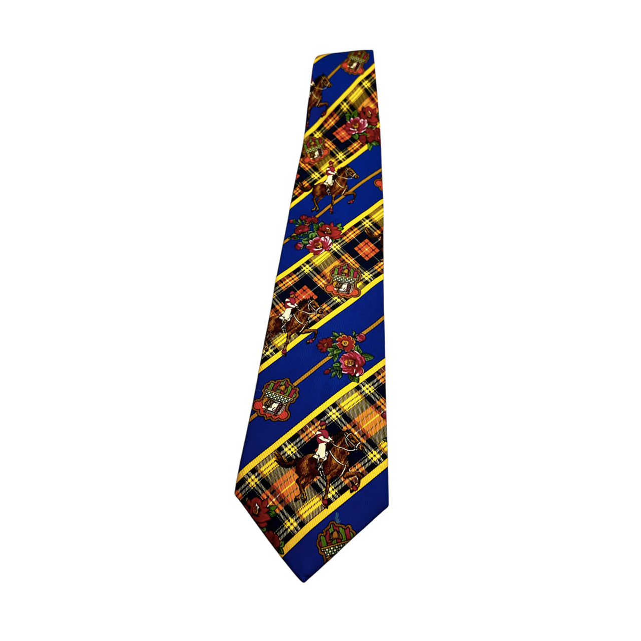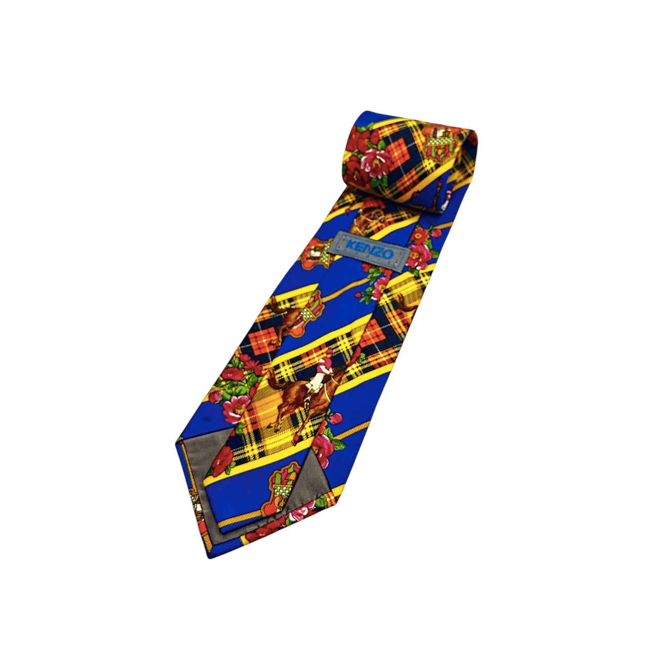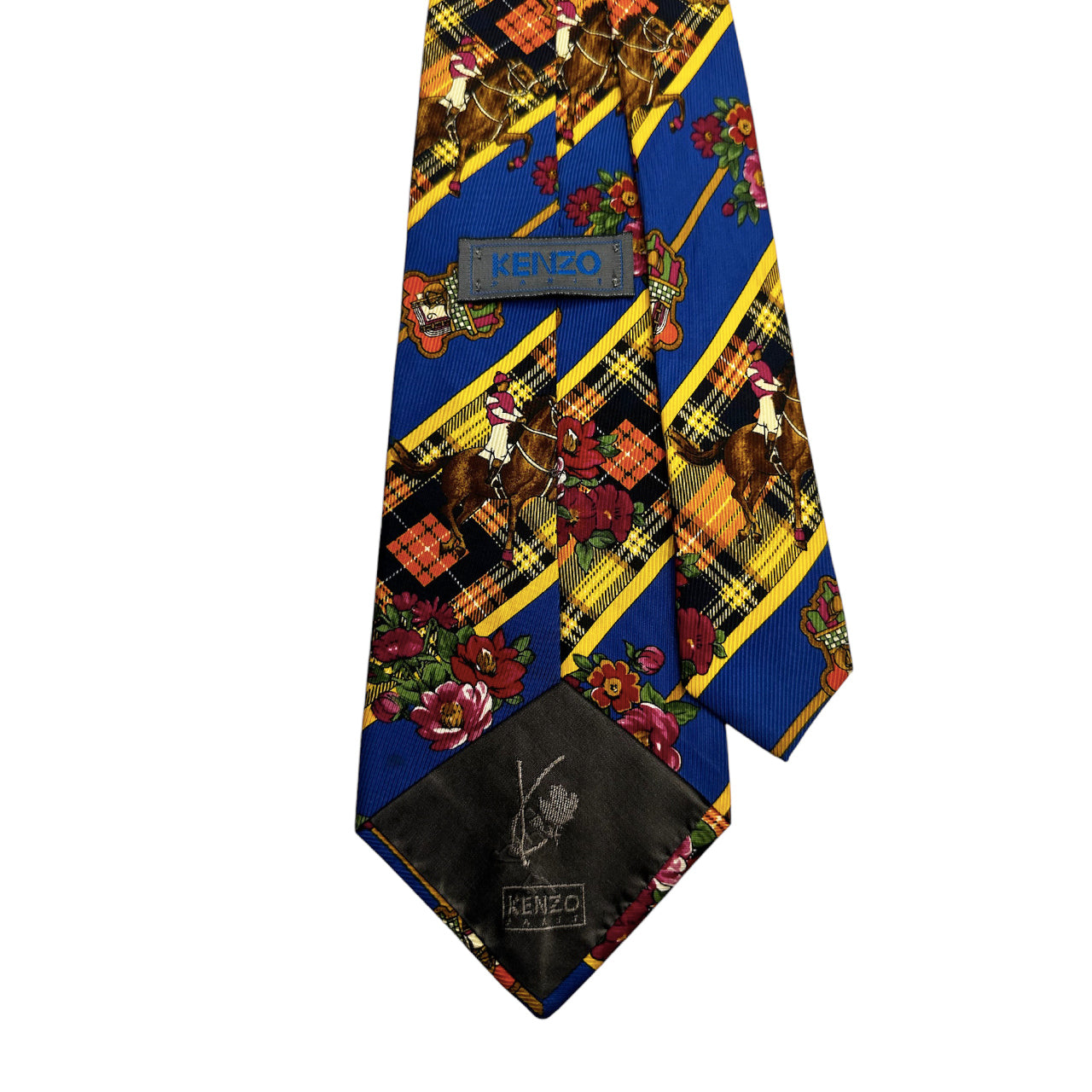 Cravatta Kenzo in seta, caratterizzata da un motivo equestre dai colori vivaci su sfondo a quadri.